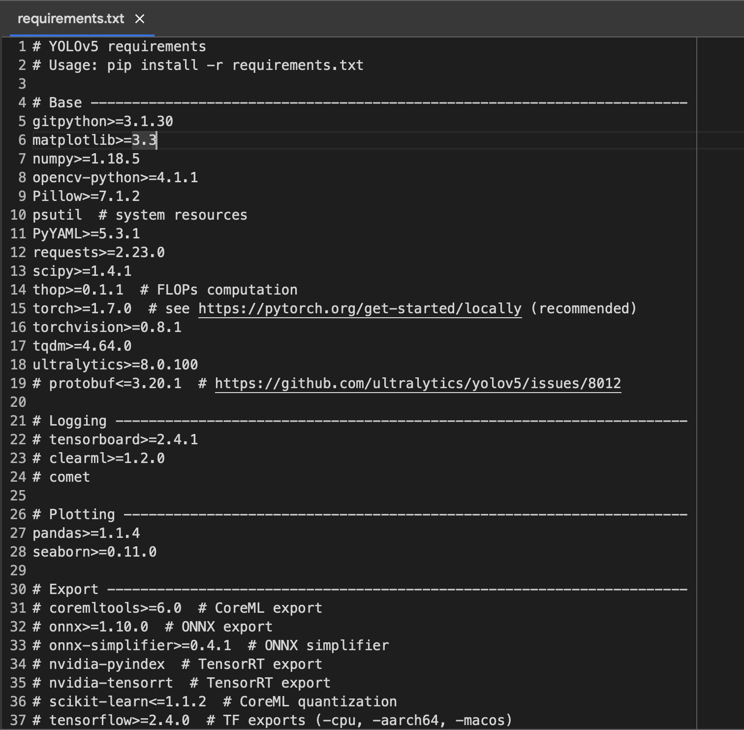 클론해온 레포의 yolov5 폴더로 이동해 requirements.txt안의 dependencies를 설치해 줍니다.