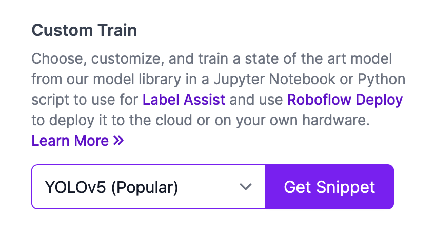 roboflow Custom Train 파트에서 원하는 모델을 선택하고 Get Snippet 버튼을 누르면 다운로드 코드를 제공해줍니다