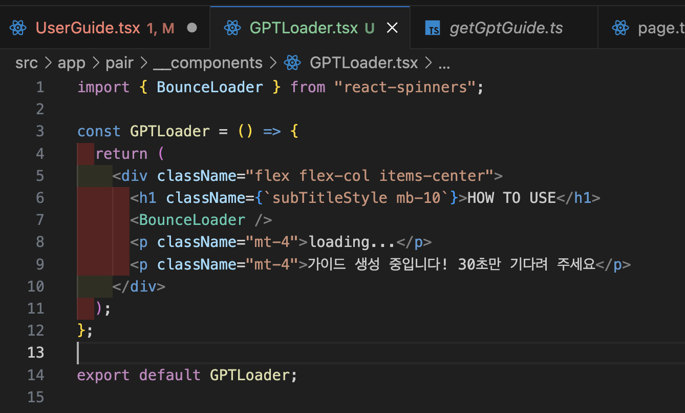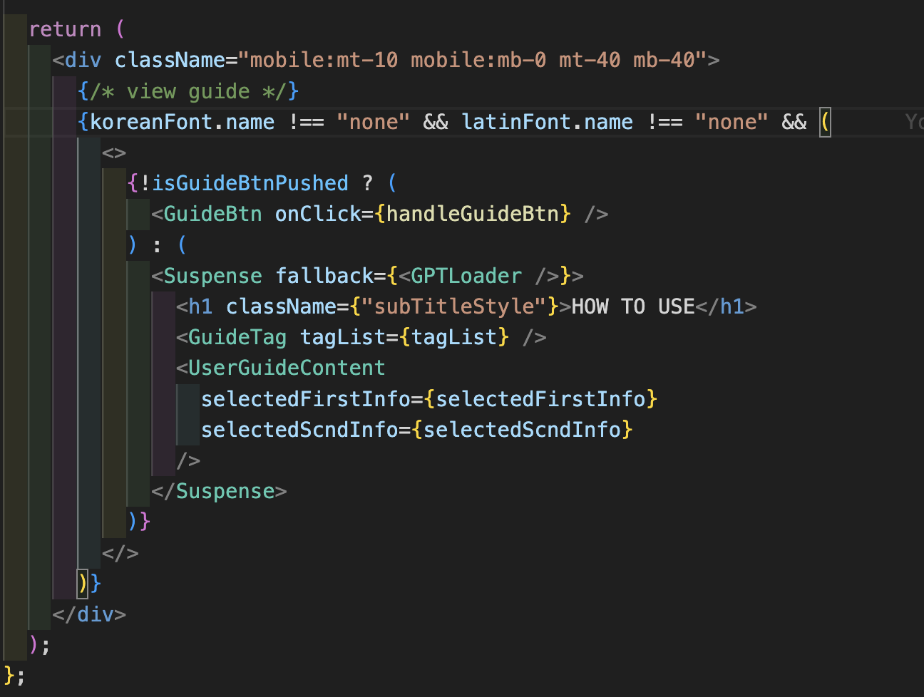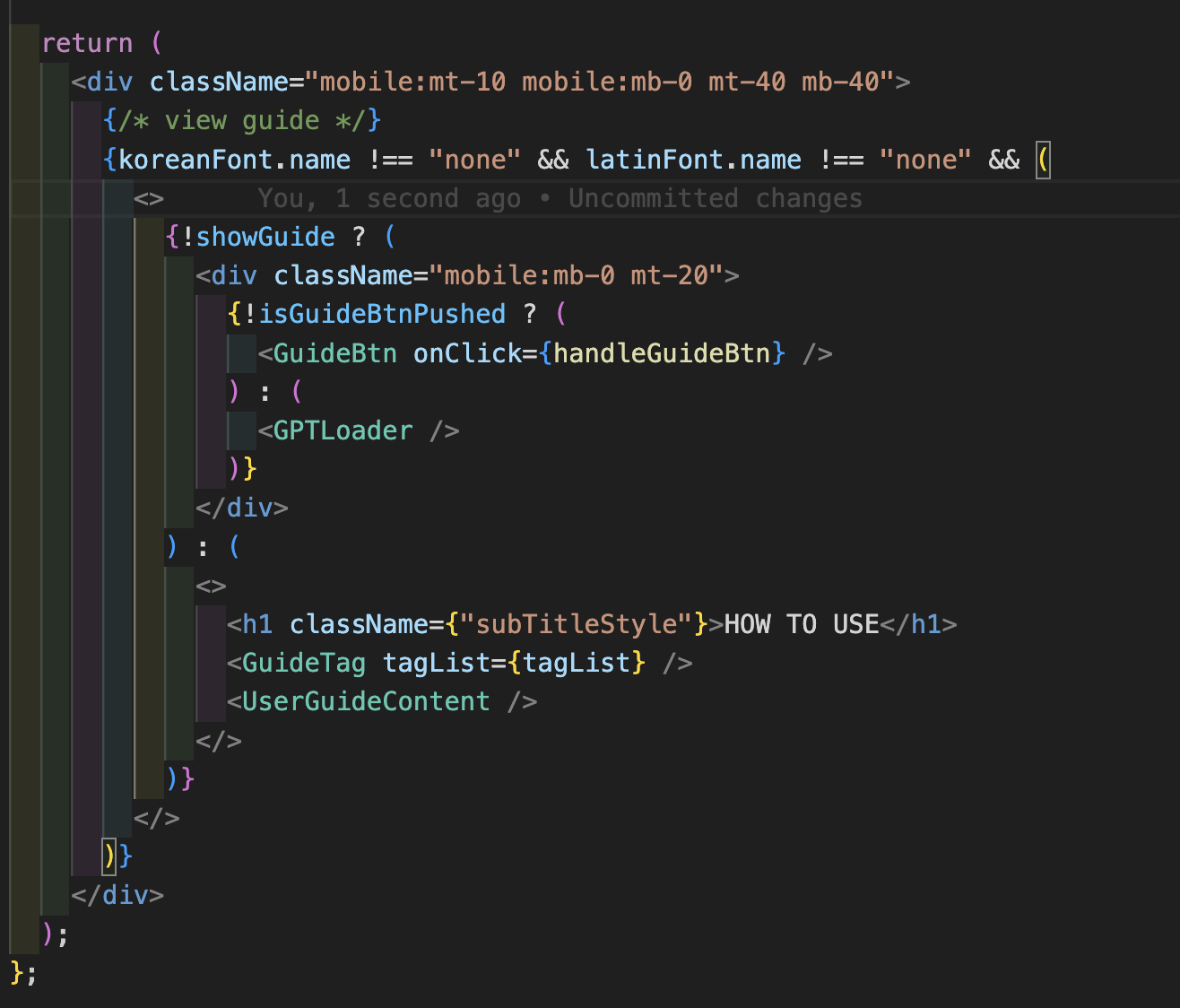 또 gpt 생성하는 시간이 꽤나 길었는지 버튼이 눌렸는지 상태, 가이드 보여줄지에 대한 상태를 분리해서 관리하고 있다.