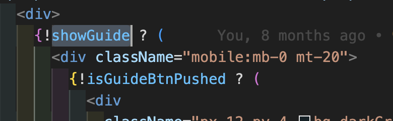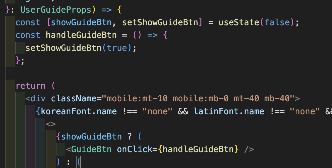 showGuide는 boolean 으로 된 state 값인데.. 이게 false 면 버튼을 보여주고, 아니면 내용을 보여준다.