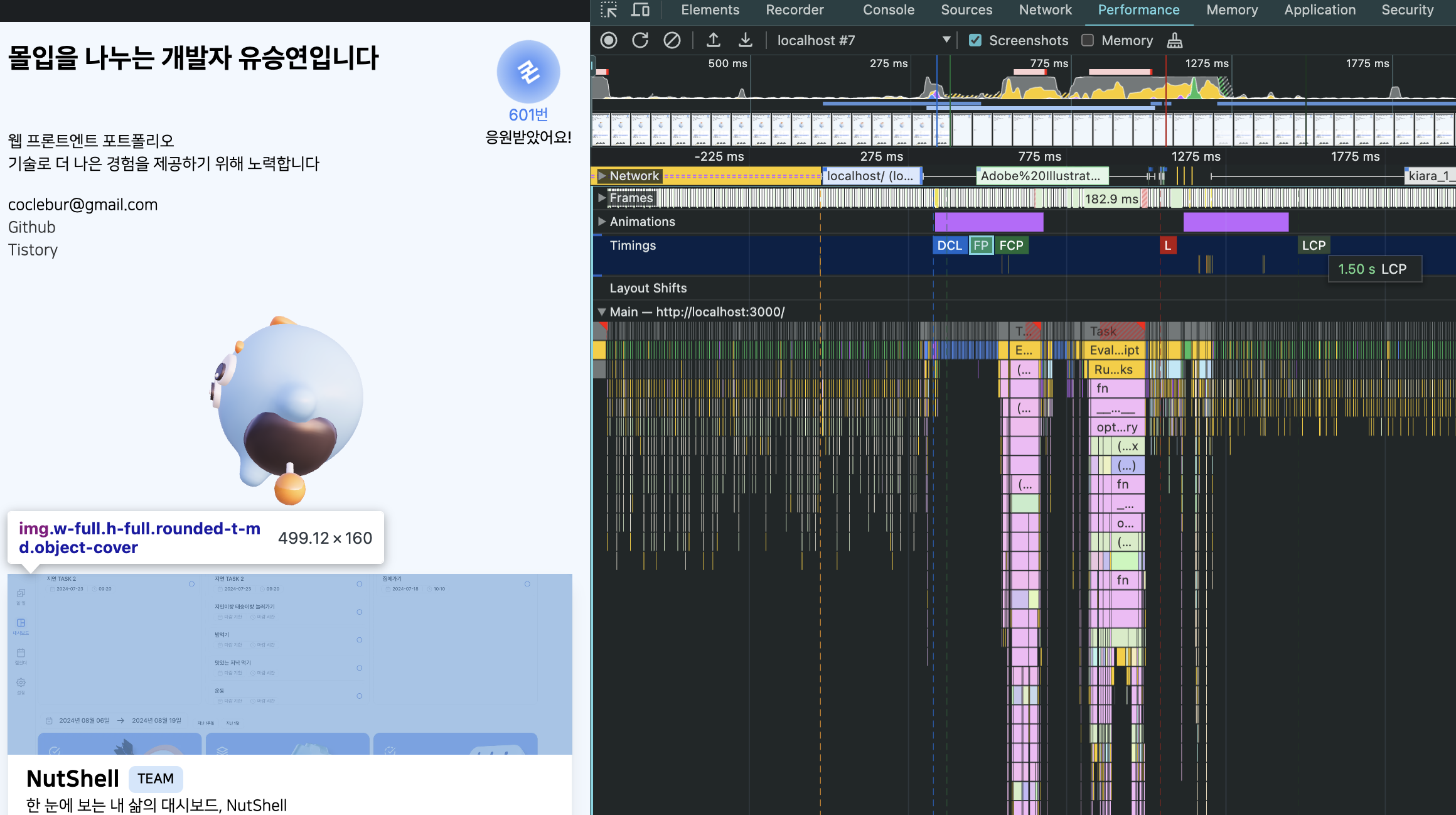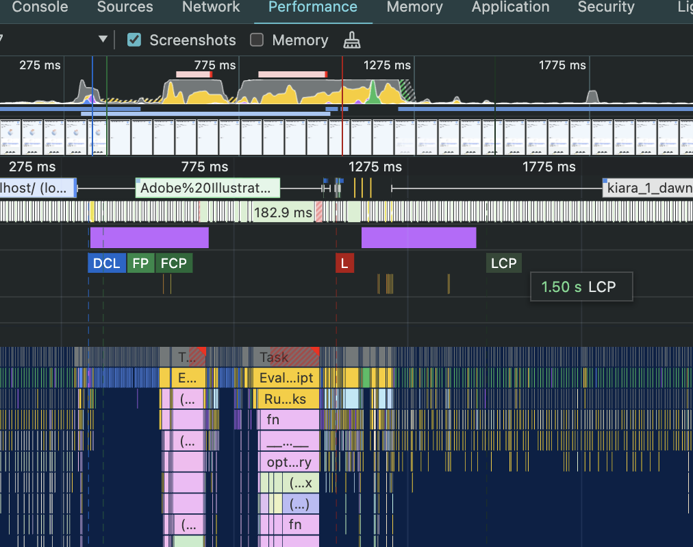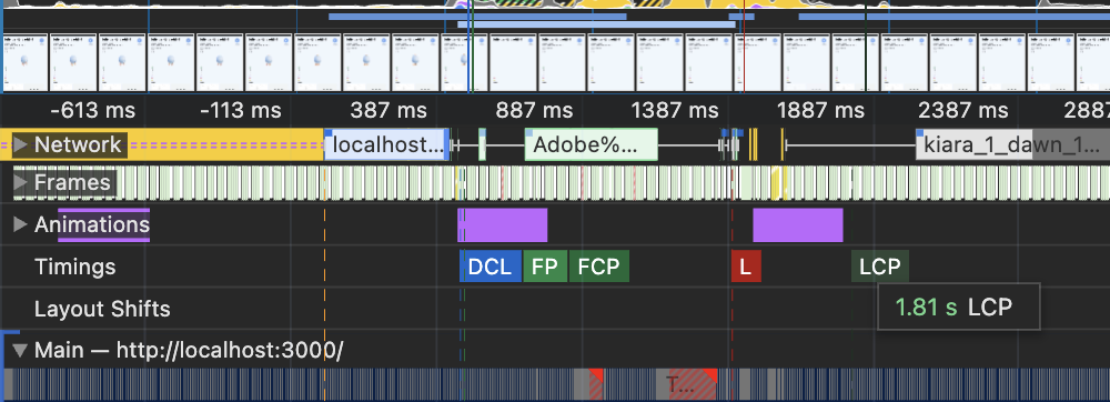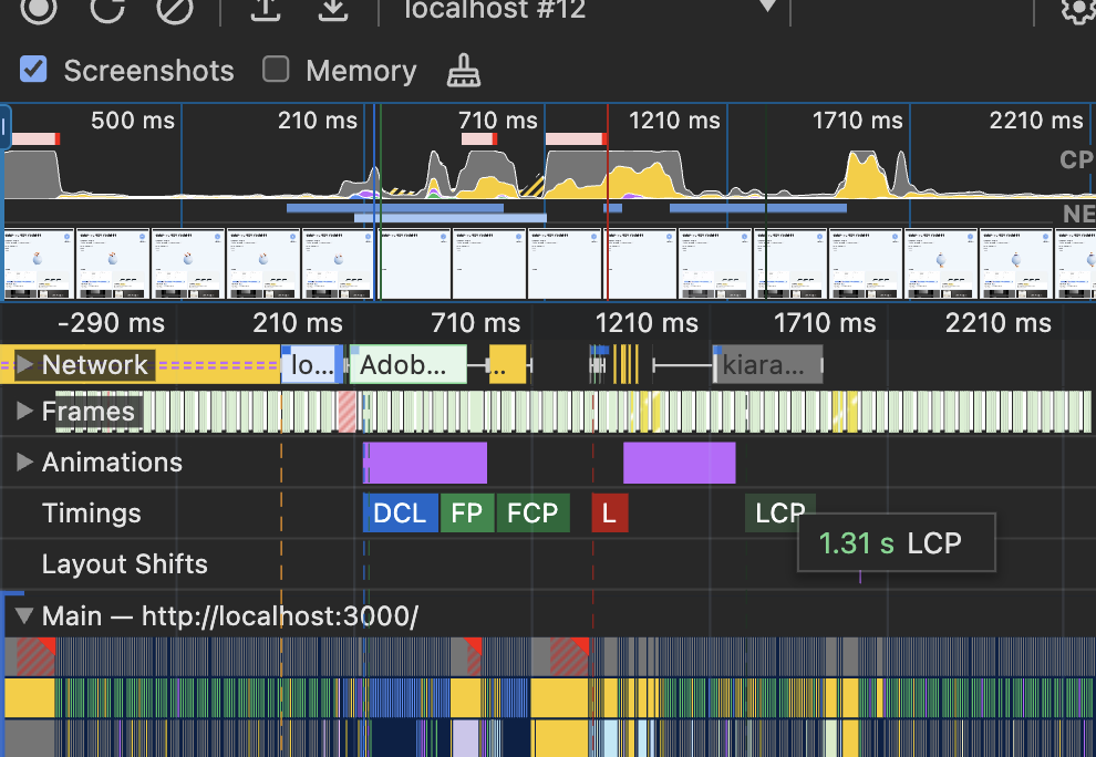 다시 살펴봤을 때 LCP가 1.5s, FP 는 395.9ms로, FP->LCP에 눈에 띄는 차이가 생겼다.