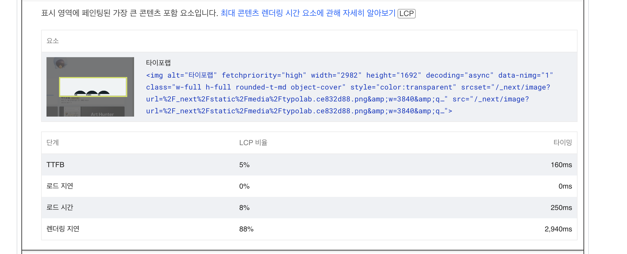 Element render delay(요소 렌더 지연): LCP 리소스가 로딩을 끝내고 LCP 요소가 완전히 렌더링 되는때까지의 사이의 값