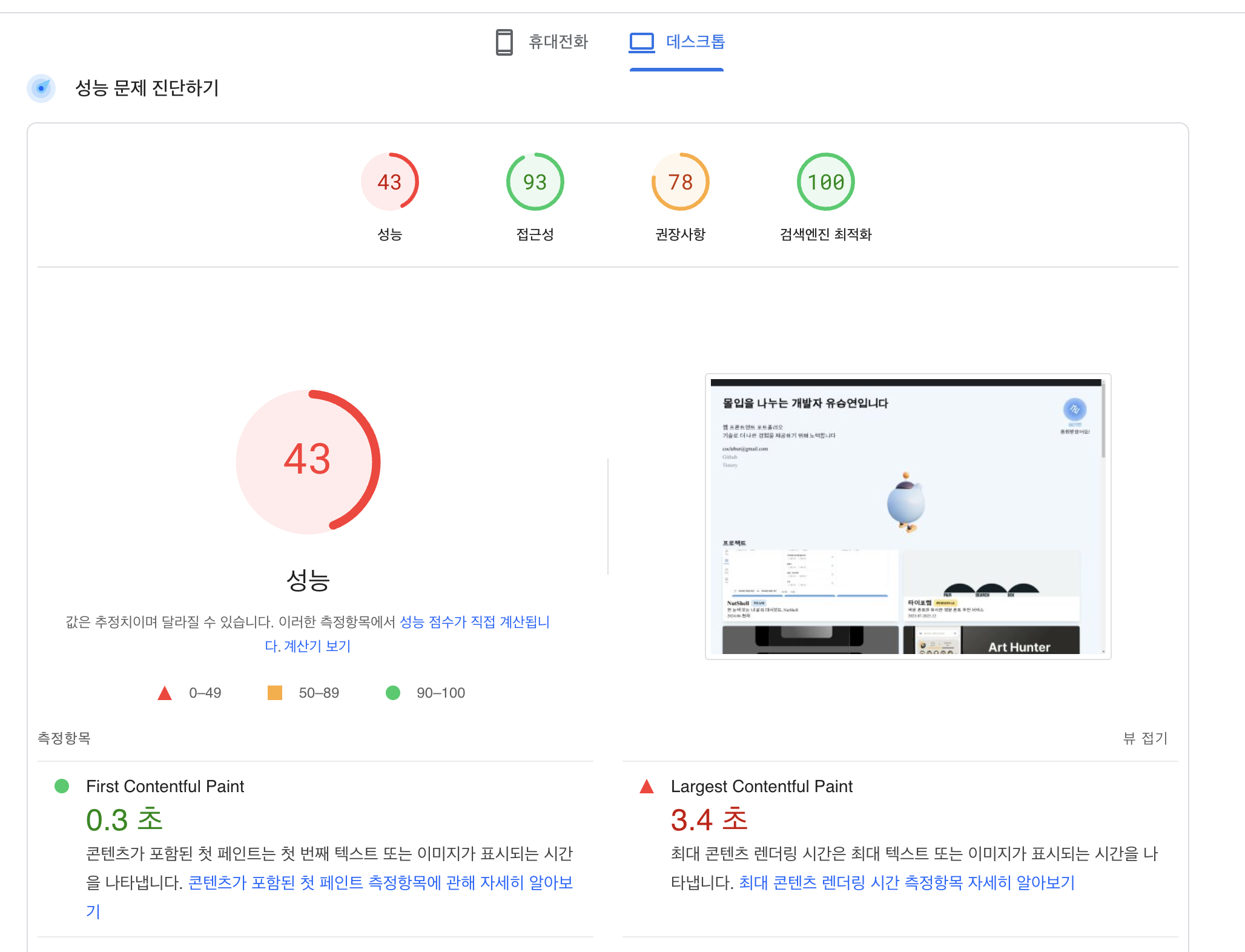 검사를 돌려 보면 LCP가 3.4초나 걸린다고 나온다.