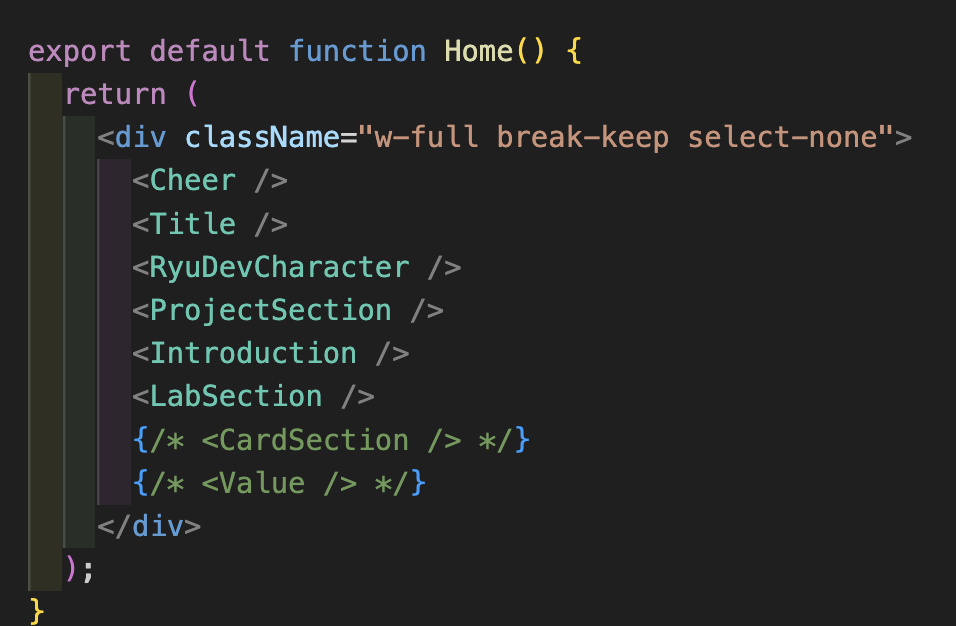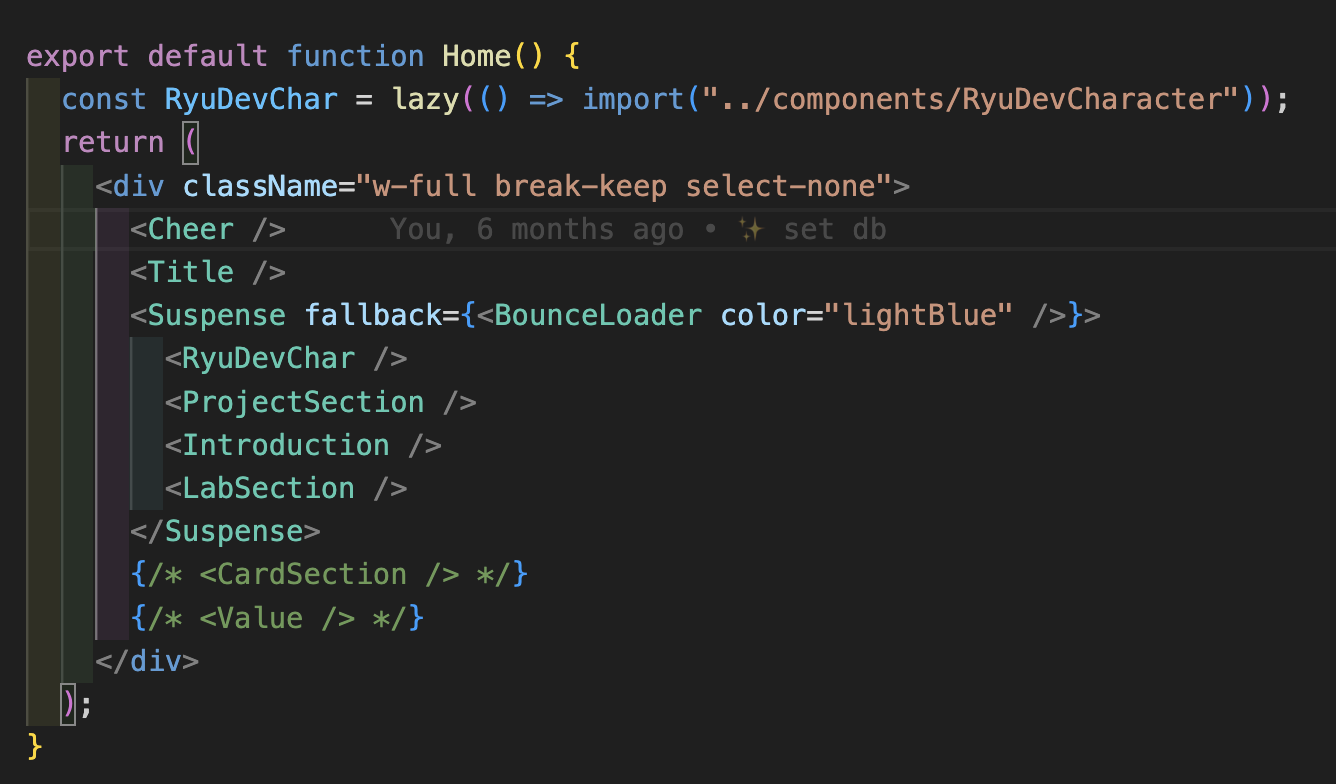 로딩 장면을 살펴보면 lazy 컴포넌트 밑 부분이 먼저 보였다가 Suspense에 의해서 로더로 교체되고, 3d 캐릭터가 있는 컴포넌트인 RyuDevChar의 로드가 완료되면 그 밑 부분이 한번에 뜨는 것으로 보인다.