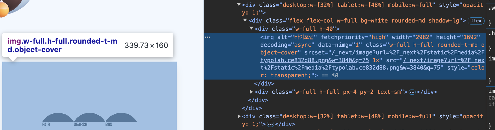 반면 왼쪽에서 표시되는 사이즈를 보면 339.73 * 160으로 훨씬 작아 이미지를 너무 크게 로딩하고 있음을 알 수 있다