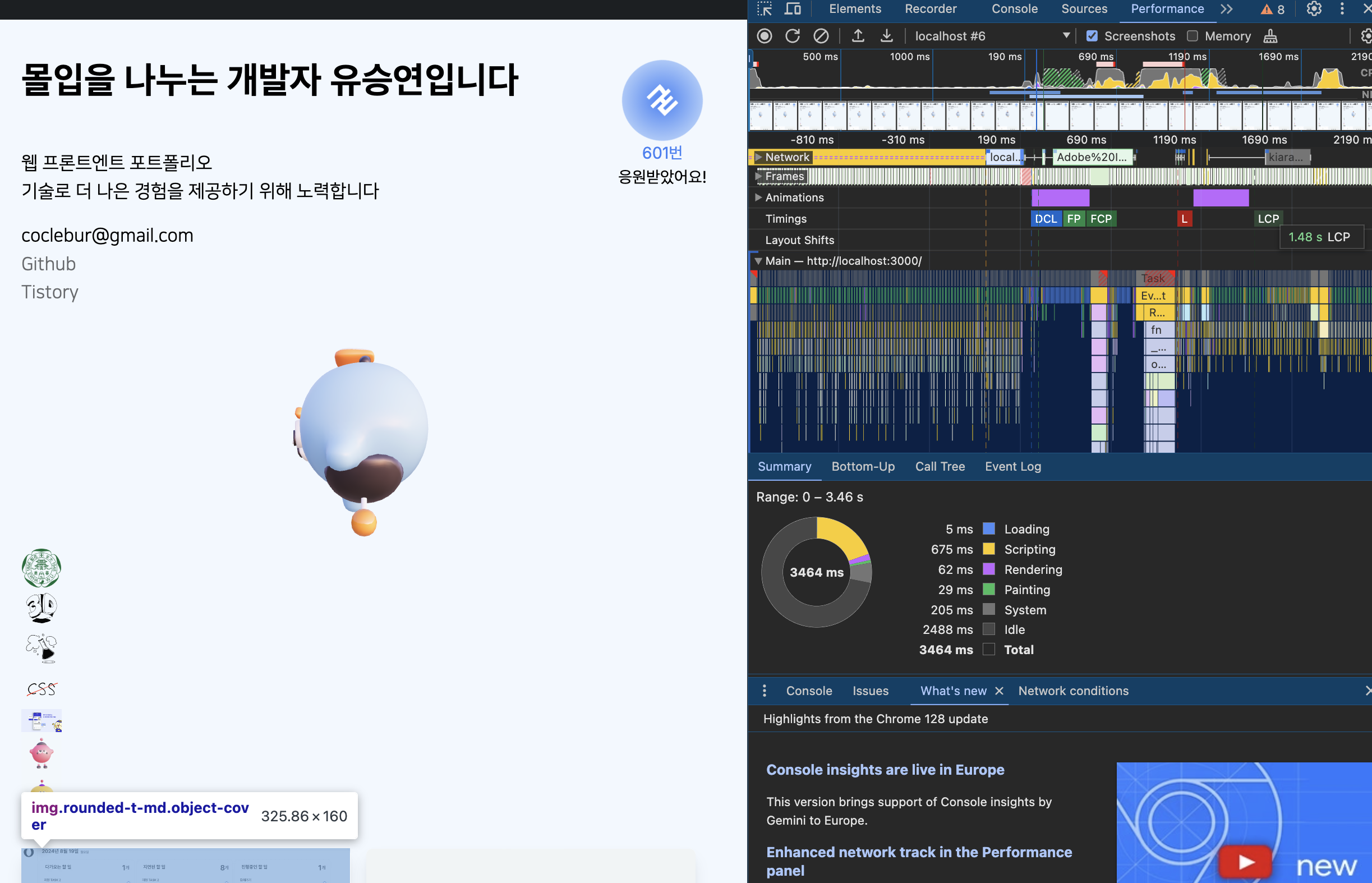 이미 렌더링이 완료된 프로젝트 섹션란을 3d가 완료되는 시점에 같이 뜨도록 해 두었으니 3d paint가 완료되는 시점에서 이 정보들이 떠 LCP 가 3초대로 형성되었던 것 같다.